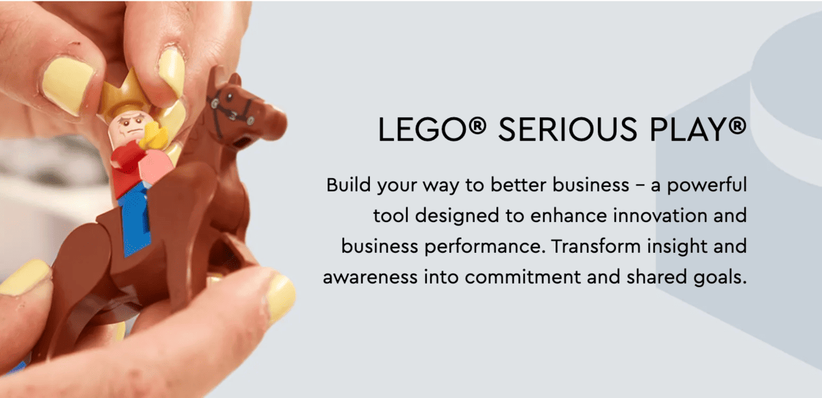 LEGO Serious Play: a hands-on, minds-on methodology that uses metaphoric building to unlock team creativity and self-awareness.